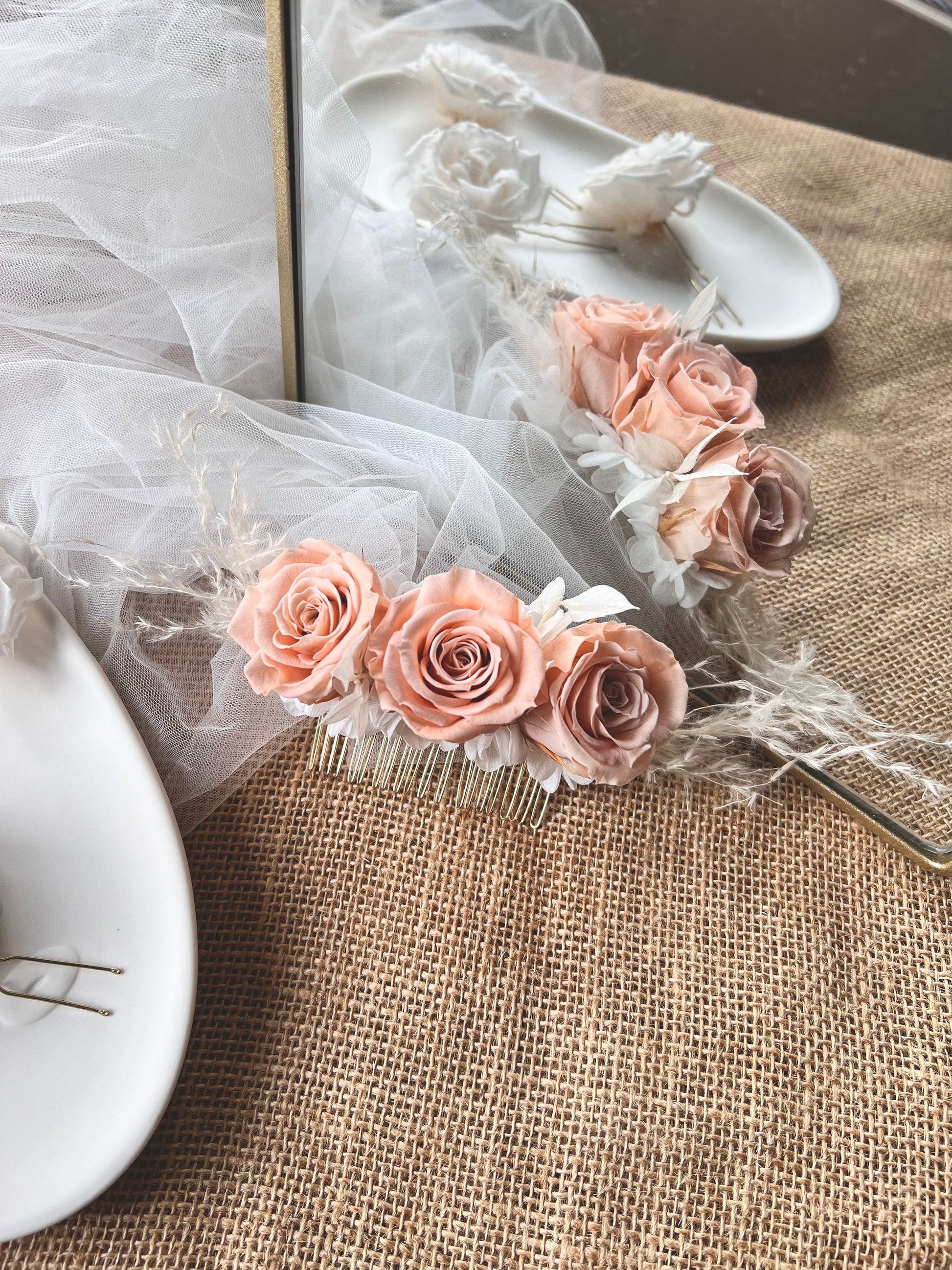Its made with long lasting preserved natural peach pink roses, white preserves ruscus and white pampas grass. The hair comb is gold coloured metal comb.